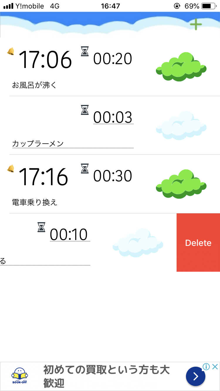 雲のボタンを押した時の気持ちいい手応えがあるよう、アニメーション処理を入れてあります。この感覚がちょっとクセになって、何回もタイマーを使いたくなるかと思います。