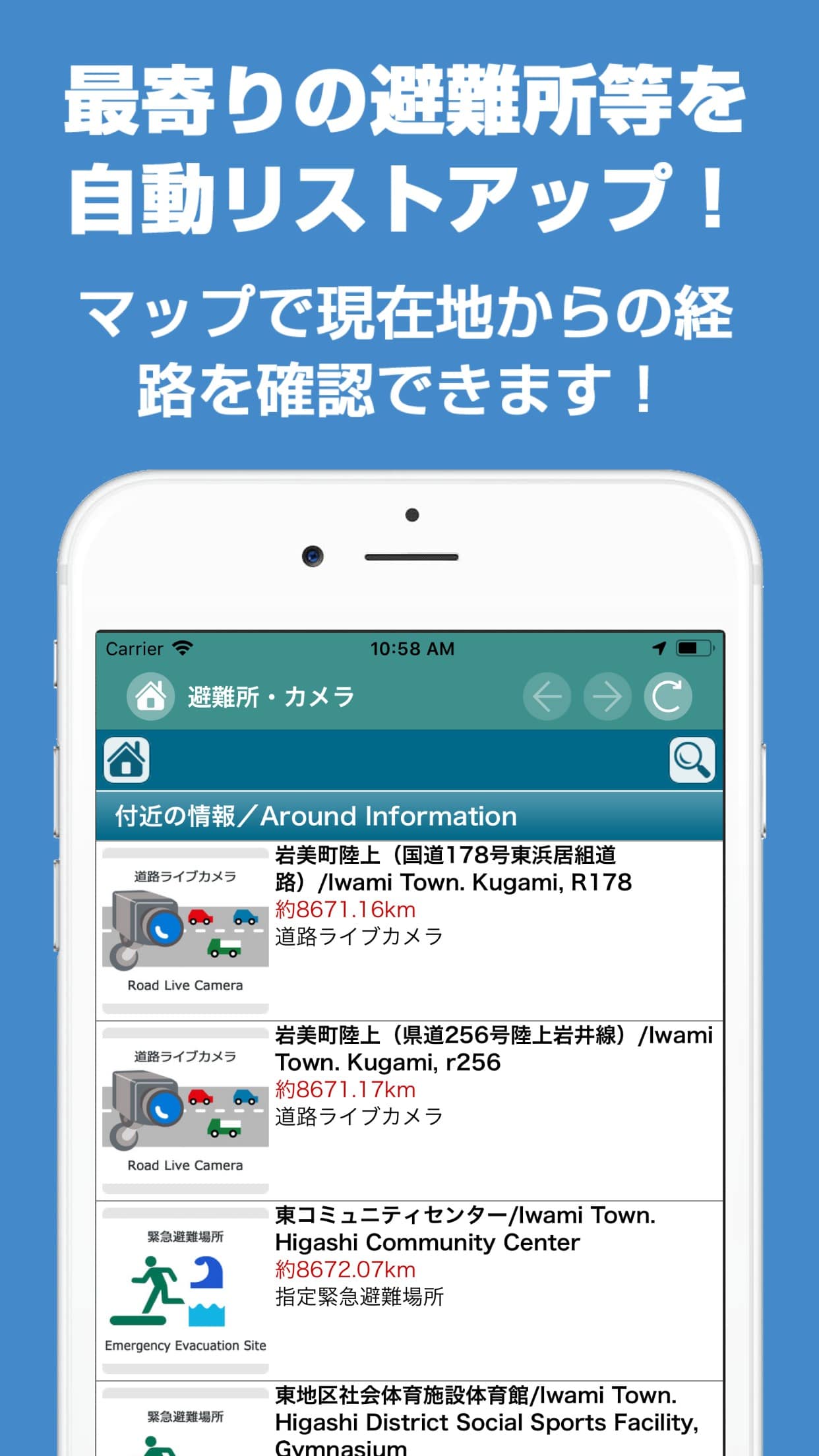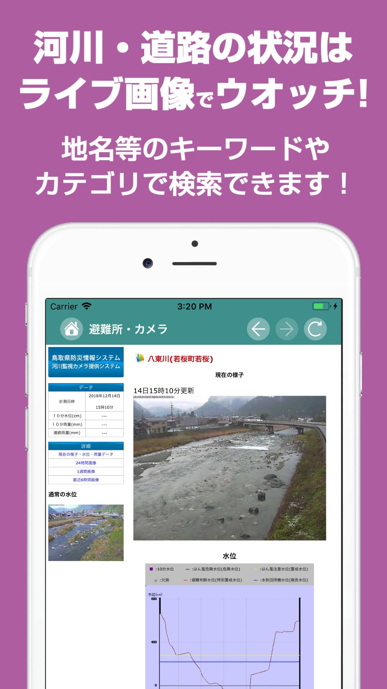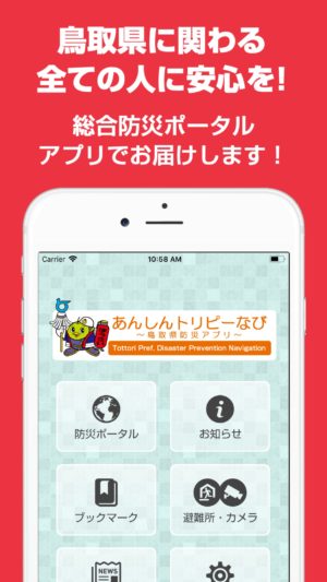 とりネット「鳥取県の危機管理ポータルサイト」や「あんしんトリピーメール」、「避難所・避難場所や河川・道路ライブカメラの情報」など、各種情報メディアで配信されている鳥取県の防災関連情報をこのアプリでまとめてご覧いただけます。
