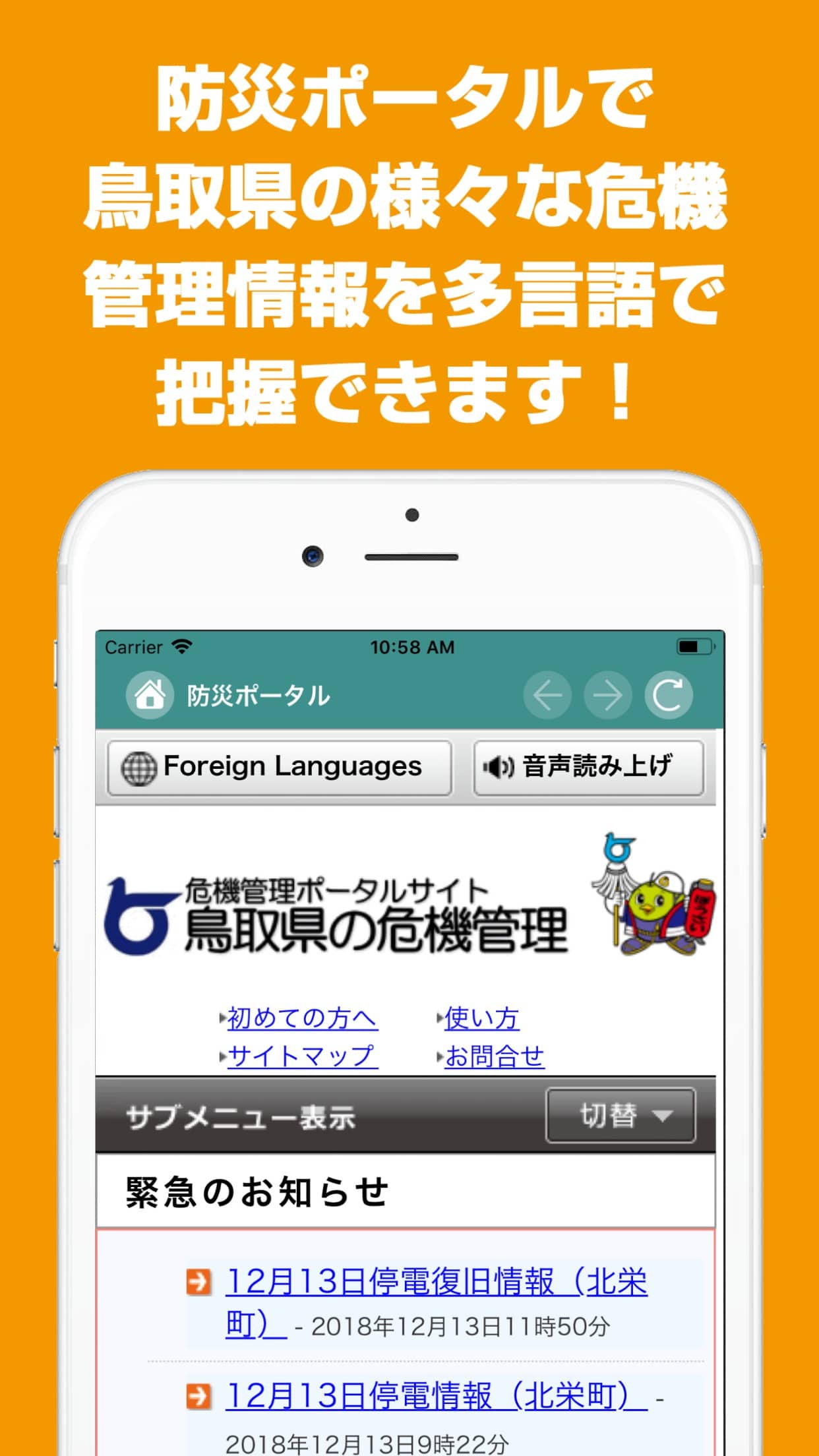 また、鳥取県の危機管理ポータルサイトや鳥取県の公式Twitter、Facebookの更新通知もこのアプリひとつで受け取り、これらのウェブサイトをすぐに確認できます。