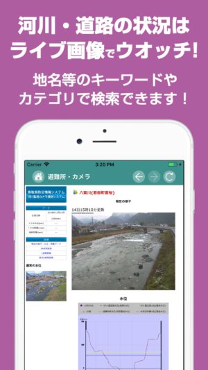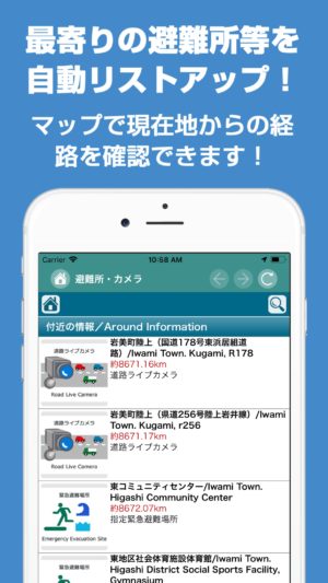 利用者の住んでいる地域やライフスタイルにあわせて通知内容を自由に設定変更することも可能です。この他にも、GPSを使って鳥取県内の最寄りの避難所への経路案内や、河川/道路のライブカメラ映像も見ることができます。