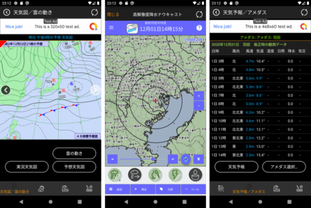 地点の設定が完了すると、TOP画面に気象カードとして登録するので、登録地点の気象情報はカードをタップして表示します。一般的な天気アプリとくらべると少しマニアックですが、天気図(実況と予想)、高解像度ナウキャストによる5分毎の雲の動き(雨雲や雷雲がチェックできます)、アメダス観測地の1時間毎の気象履歴、もちろん地点の天気予報も表示できます。