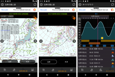他にも、沿岸や外洋の風や波の情報(波浪気象情報の実況と予想)やタイド情報も表示できます。