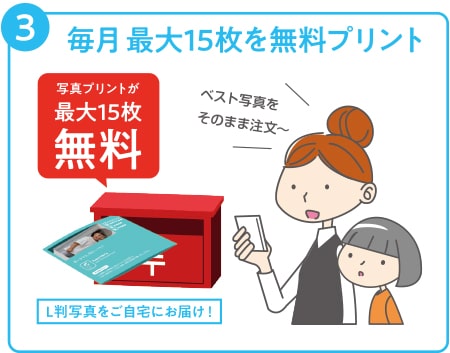 使用料無料・容量無制限に加えて写真プリントが最大15枚まで無料、フォトシート印刷が最大4枚まで無料なので、お財布に優しい仕様となっております。