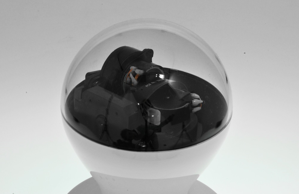 一瞬素敵な照明器具か?とも思ったのですが、違いました。冷静に見ると透明なドームの中は、精密な機械が。実はこれ監視カメラでした、その名も『O!Care』。どういうネーミングでしょうか。不思議です。でもこんなおしゃれな形をした監視カメラを見たことがないので、初めてみる人もまさかこれで監視されていると思わないのではないでしょうか。
