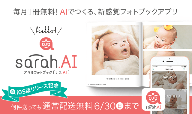 sarah.AI(サラ.エーアイ)は「プチプラフォトブック」でおなじみsarah[サラ]の姉妹アプリ。sarah[サラ]で人気のデザインやテイストはそのままに、アプリの「かしこさ」と「便利さ」がアップ。さらに無料で作れる「手軽さ」を追加した、新しいフォトブックサービスです。