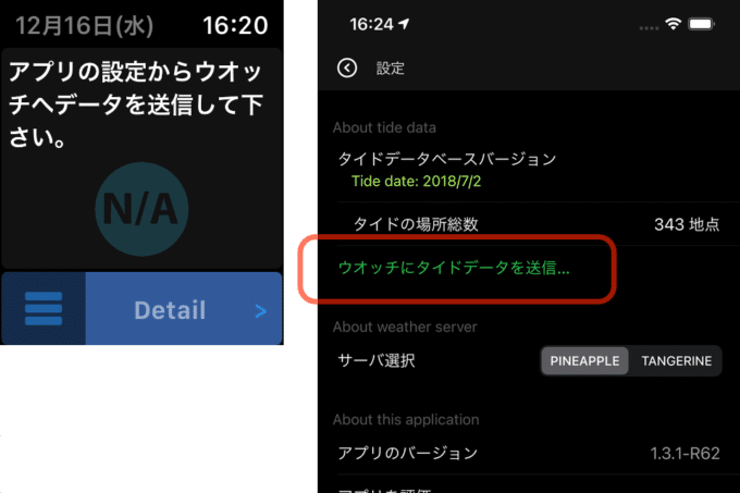 利用するにはペアリングしたウオッチで「SurfTideΔ」を表示し、iPhoneの近くに置いて下さい。次に、アプリ側の設定から「ウオッチにタイドデータを送信」をタップすると利用できるようになります。