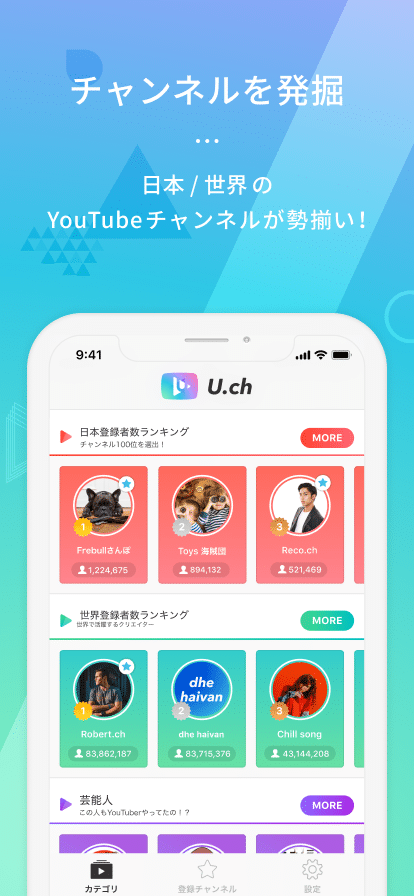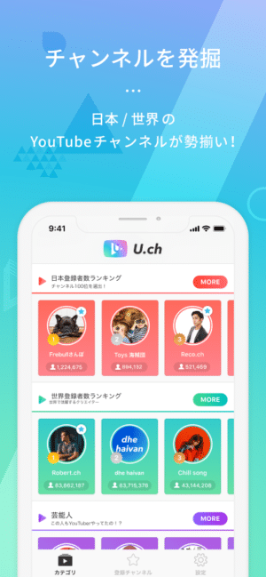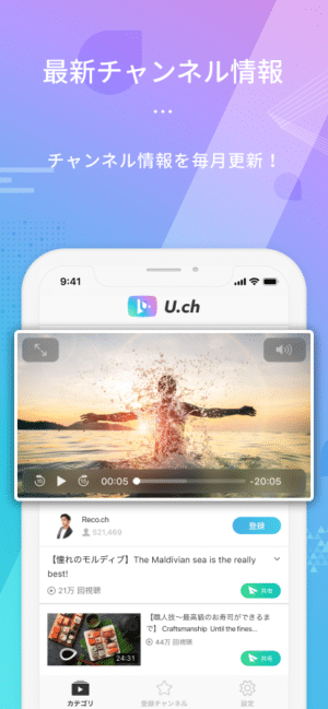 「U.ch」とは数多く存在するYouTubeチャンネルを各カテゴリ別に視聴できるアプリです。