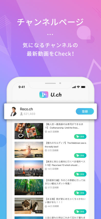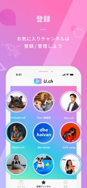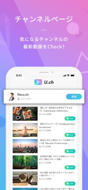 また、お気に入りのチャンネルを発掘し、「U.ch」内で登録することでいつでも簡単に登録チャンネルの動画閲覧も可能です。